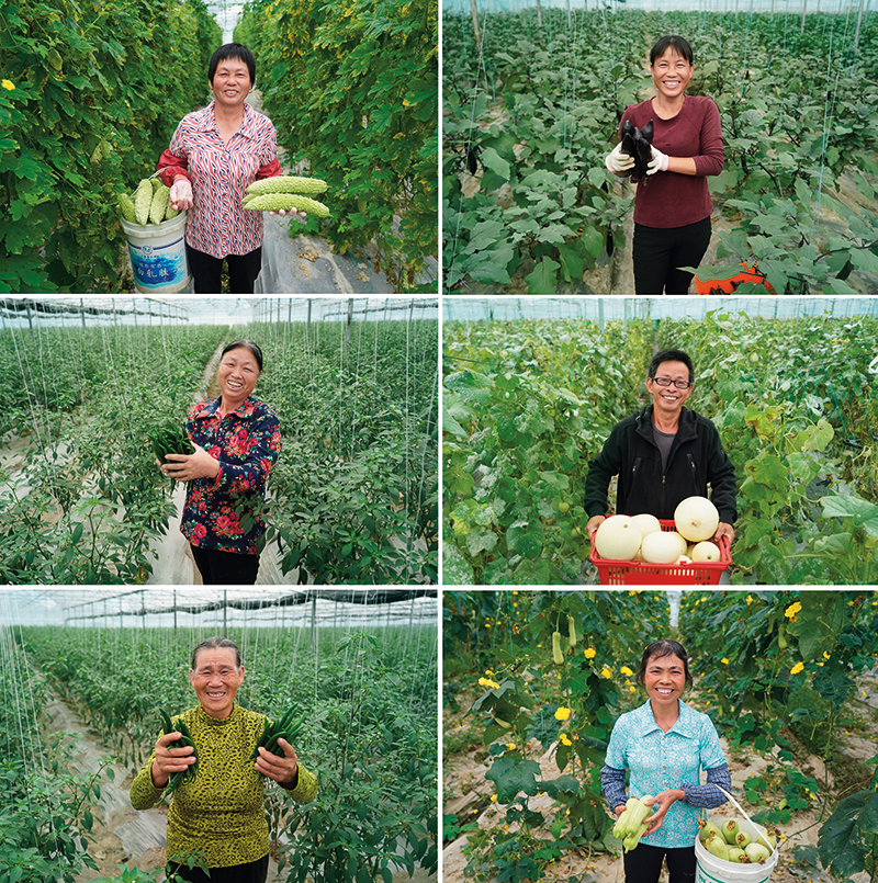 江西省贛州市于都縣梓山鎮潭頭村的果蔬種植基地,村民們展示收獲的蔬菜(2020年10月21日攝) 萬象攝/本刊