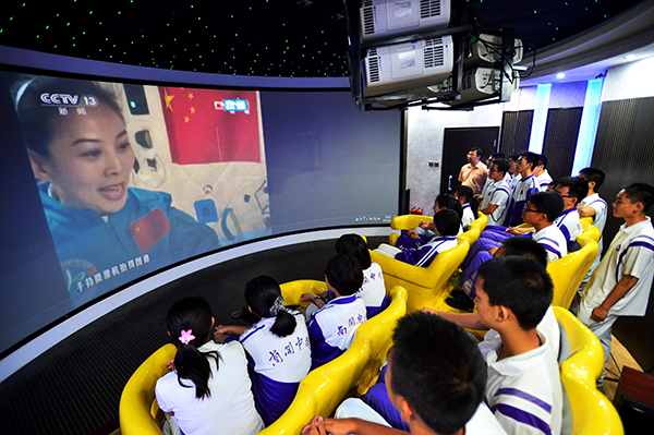 圖為2013年6月20日,在南開中學航天體驗館,學生們通過弧形屏幕觀看中國首次太空授課。