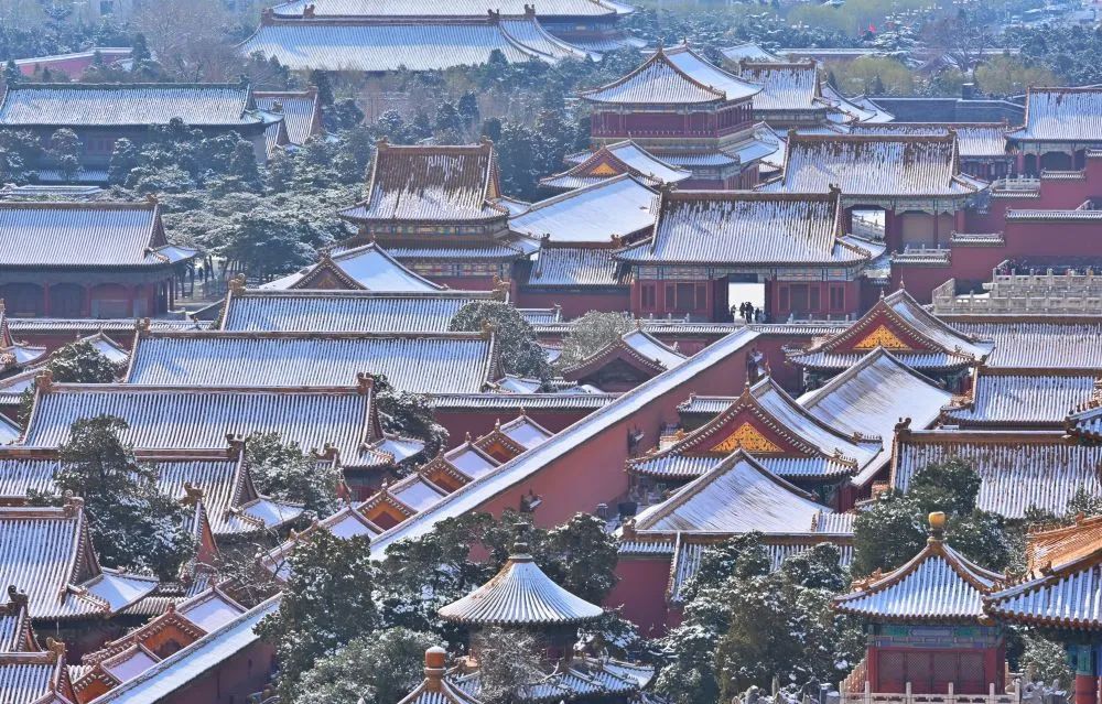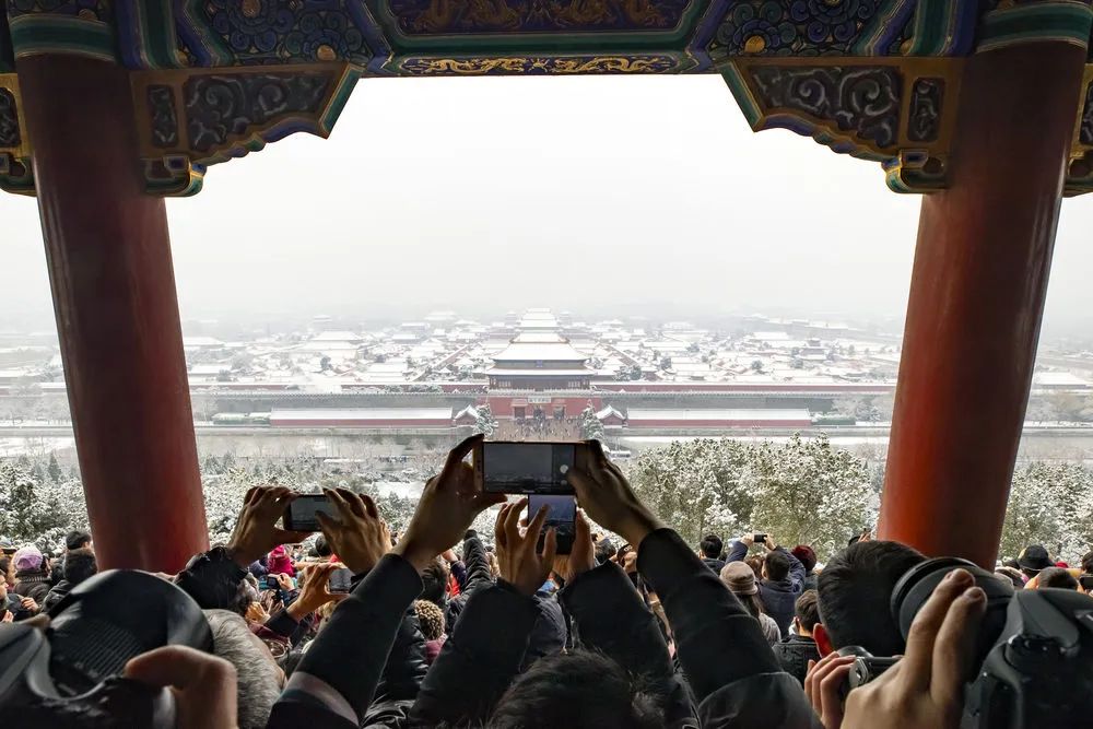 人們?cè)诒本┚吧焦珗@的萬(wàn)春亭拍攝雪后的故宮(2019年11月30日攝)。新華社記者 沈伯韓 攝