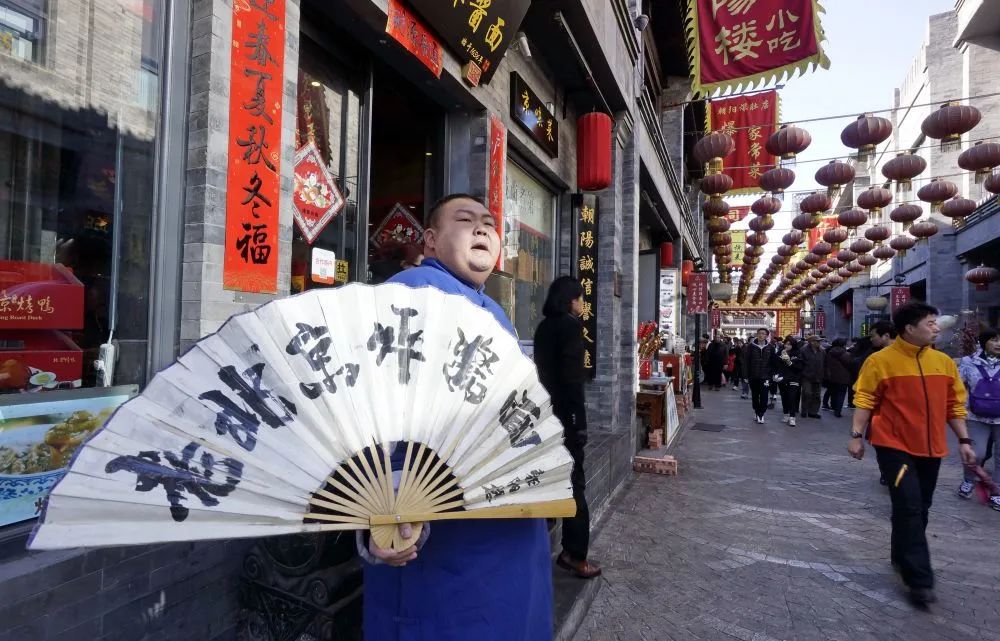 北京前門(mén)大街一家老字號(hào)的工作人員在門(mén)口迎客(2017年2月5日攝)。新華社記者 李欣 攝