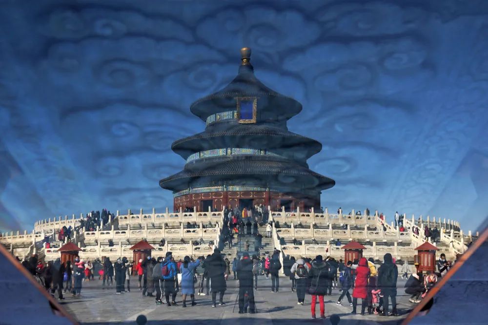 這是2021年2月17日通過(guò)玻璃反光拍攝的游客在天壇公園參觀游覽(照片旋轉(zhuǎn)180度)。新華社記者 鞠煥宗 攝