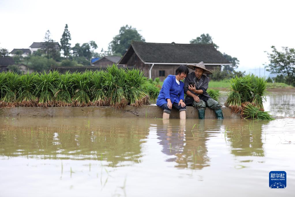 6月10日,在貴州省黔東南苗族侗族自治州丹寨縣興仁鎮燒茶村,村民整理秧苗間歇,坐在水田旁觀看手機視頻。