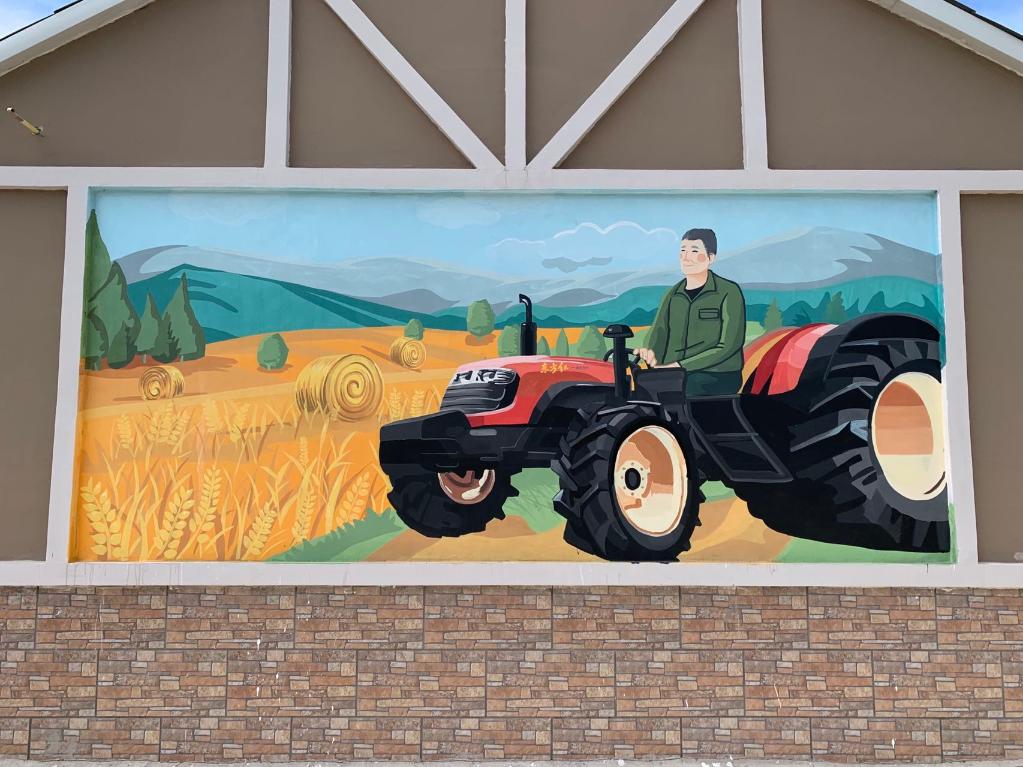 在西口村易地扶貧搬遷小區(qū)3棟1號房屋山墻上,有一幅色彩絢麗、描繪豐收的墻繪