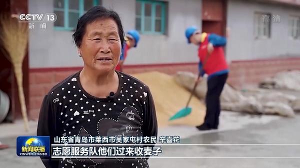 在山東萊西,66萬(wàn)多畝小麥進(jìn)入集中收獲期,當(dāng)?shù)?0多家社會(huì)化服務(wù)組織和志愿服務(wù)隊(duì)活躍在麥?zhǔn)找痪。吳家屯村農(nóng)民辛喜花的孩子在外打工,在志愿服務(wù)隊(duì)幫助下,她家3畝多小麥不到一小時(shí)就收獲完成運(yùn)送到家。