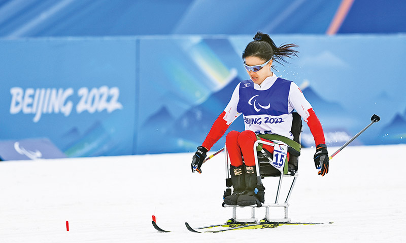 在北京冬殘奧會上,中國代表團運動員全項參賽、勇于超越,自強不息、團結拼搏,奏響了堅韌不屈、樂觀進取的生命凱歌,不僅體現出殘疾人的體育精神與實力,更體現出中國人權保障與國家發展的成績。圖為2022年3月9日,中國代表團運動員楊洪瓊在殘奧越野滑雪女子短距離(坐姿組)比賽中。 新華社記者 楊冠宇/攝