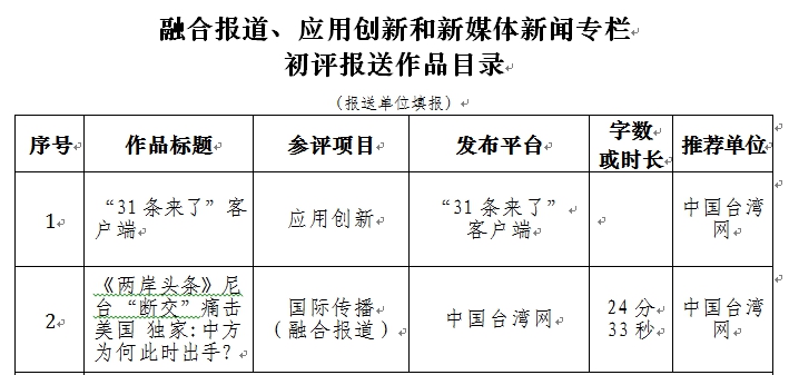 中國臺灣網關于參評第三十二屆中國新聞獎的公示