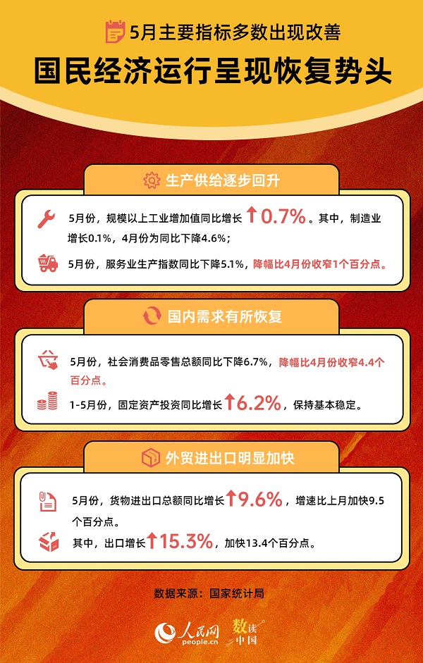 生產供給逐步回升,國內需求有所恢復,外貿進出口明顯加快……15日,國家統計局公布多項數據表明,5月份主要指標多數出現改善,國民經濟運行呈現恢復勢頭。