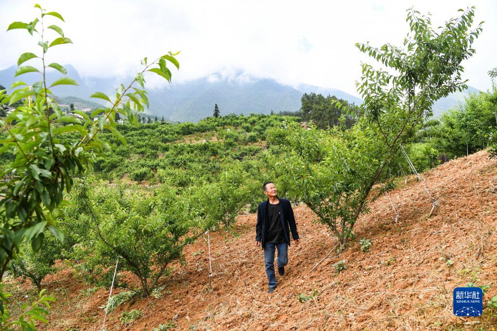 5月19日,重慶市巫山縣曲尺鄉權發村村民在查看脆李生長情況。新華社記者 王全超 攝