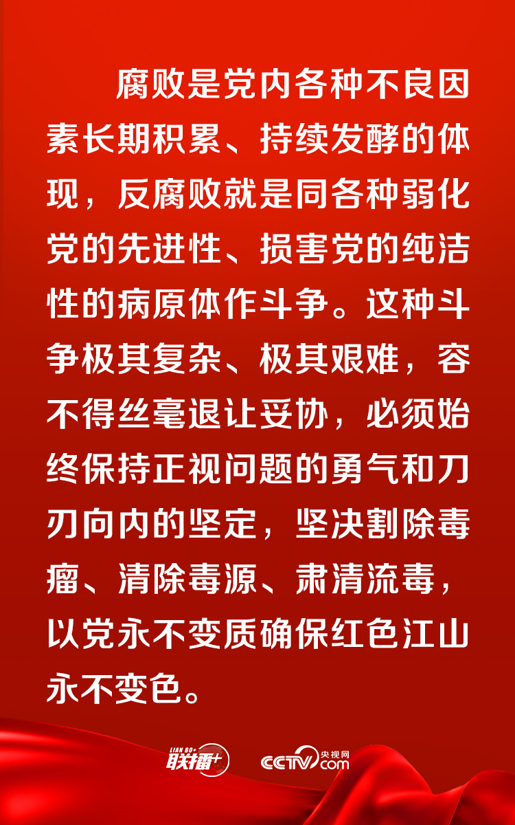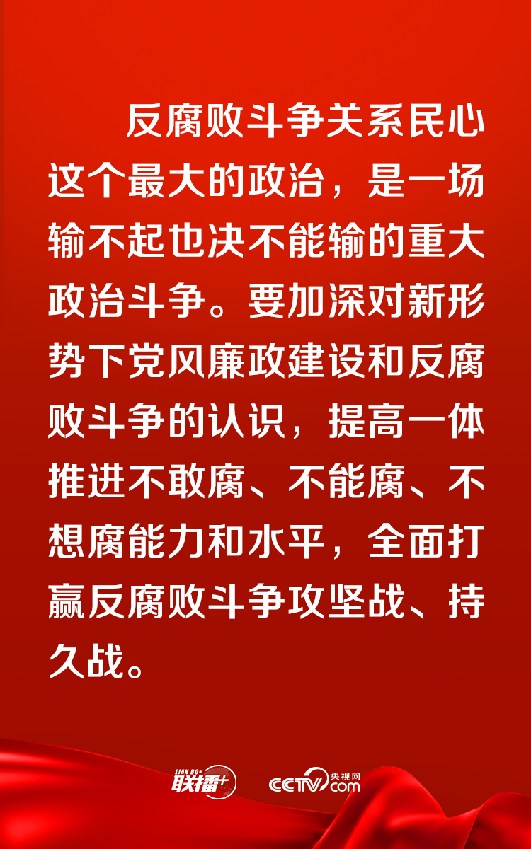 ▲要加強(qiáng)黨中央對(duì)反腐敗工作的集中統(tǒng)一領(lǐng)導(dǎo),發(fā)揮黨的政治優(yōu)勢(shì)、組織優(yōu)勢(shì)、制度優(yōu)勢(shì),壓實(shí)各級(jí)黨委(黨組)全面從嚴(yán)治黨主體責(zé)任特別是“一把手”第一責(zé)任人責(zé)任,貫通落實(shí)相關(guān)職能部門監(jiān)管職責(zé),健全各負(fù)其責(zé)、統(tǒng)一協(xié)調(diào)的管黨治黨責(zé)任格局。