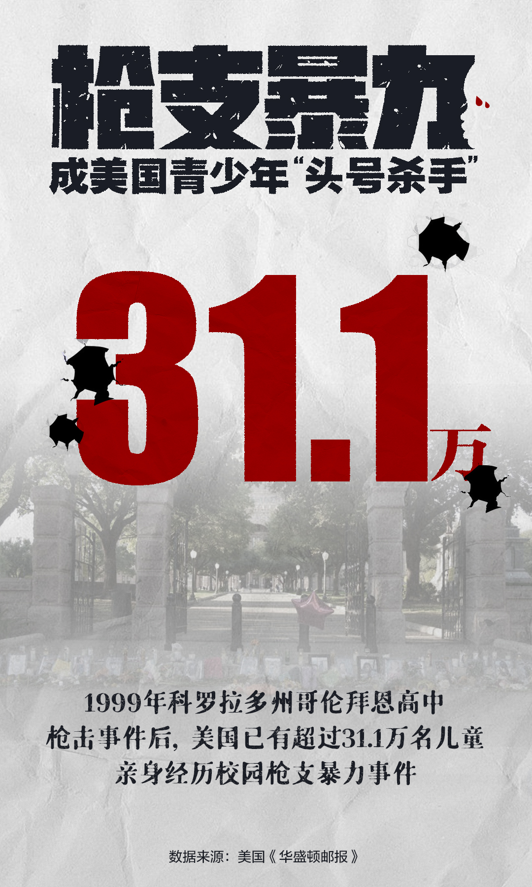 據(jù)《華盛頓郵報》調(diào)查顯示,1999年科羅拉多州哥倫拜恩高中槍擊事件后,美國已有超過31.1萬名兒童曾親歷校園槍支暴力事件。由于槍支泛濫,部分美國青少年甚至走上歧途,反而成為涉槍傷害事件的加害者。