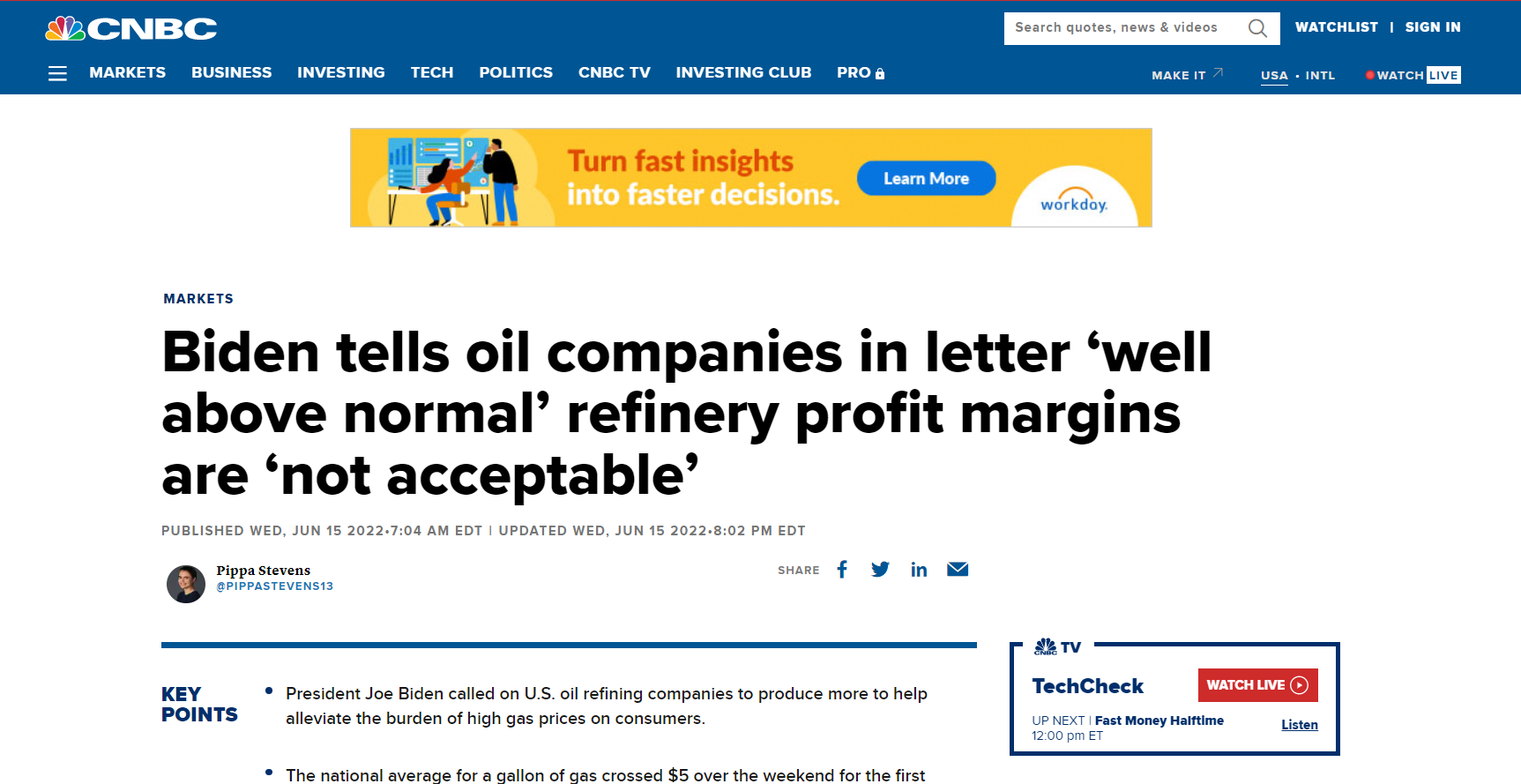 △美國全國廣播公司報道,拜登在信中告訴石油公司,煉油廠利潤率遠高于正常水平是不可接受的
