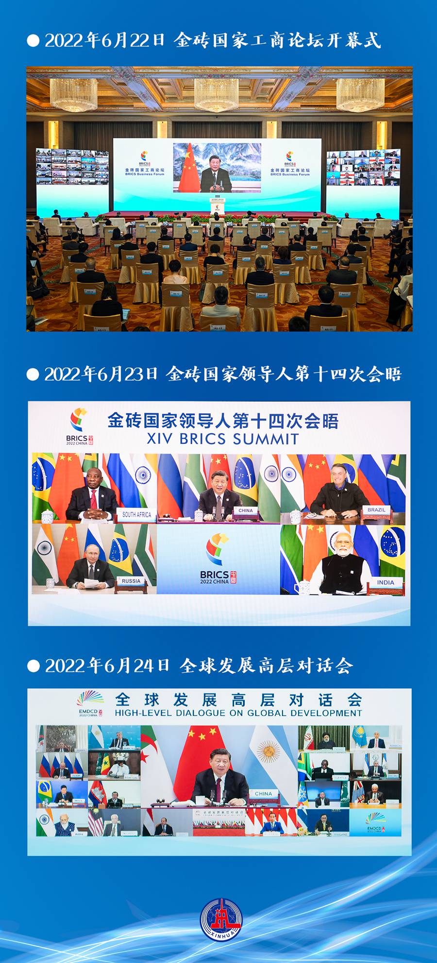 6月22日至24日,金磚“中國年”的高光時段,連續三個晚上,習近平主席以視頻方式相繼出席金磚國家工商論壇開幕式,主持金磚國家領導人第十四次會晤、全球發展高層對話會。