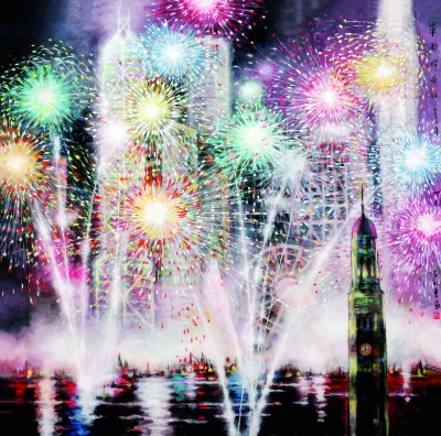 我用都市水墨的形式來表達(dá)出煙花綻放在維多利亞港的璀璨夜景,以此來呈現(xiàn)香港進(jìn)入一個新的時代——回歸祖國懷抱。之所以選擇用煙花來表達(dá),是因為香港每到重要的節(jié)日,都會舉辦煙花匯演,焰火照耀星空,歡聲雷動,太平盛世展現(xiàn)在人們眼前。香港自回歸祖國25年來,經(jīng)濟(jì)社會各方面都得到穩(wěn)定發(fā)展,我相信背靠祖國,香港會有更美好的前景。