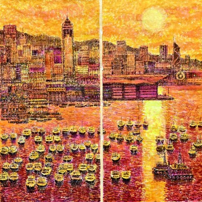 我家住在海灣邊上,從窗口望出去常常就是這樣一片金色的港灣。香港從一個小漁村,發(fā)展成為國際化大都市,有很多可歌可泣的故事。我畫的港灣,有很多香港的代表性建筑,海面上有游艇、吊船,也停了小漁船。在技法上,我畫得比較粗獷,不是那種很講究的描繪。我是先把紙揉皺了以后再畫的,有很多斑斑駁駁的肌理。這種肌理效果實際上承載著一種歷史的沉淀、歷史的痕跡。色彩是金黃色的,在太陽照射下,港灣光芒萬丈,象征著美好的香港,也祝愿香港經(jīng)歷風(fēng)雨后能夠有更美好的明天。