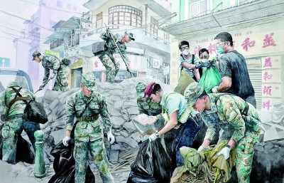 這是一幅寫實的水彩畫,站在廢墟之上的解放軍、警察和市民,或手持鐵鍬清理倒塌的磚墻,或手拿垃圾袋裝填雜物……他們互相幫助、齊心協(xié)力,專注而有愛。畫中元素飽滿而不凌亂,色彩勻稱和諧,畫中人物的動作、姿態(tài)與表情雖然不一樣,但并沒有沖突感,反而有一種和諧的美。這是我這幅畫想要帶給觀眾的視覺感受,同時也想傳遞給人們一種不懼風(fēng)雨、齊心協(xié)力、擔(dān)當(dāng)有愛的精神。