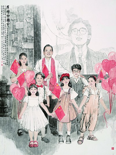 搞藝術(shù)創(chuàng)作,技術(shù)手法是基礎(chǔ),作品的思想性更為關(guān)鍵。好的作品要有思想、有感染力,創(chuàng)作者首先自己要情緒飽滿。我反復(fù)聆聽和哼唱《我的中國心》,內(nèi)心無比澎湃,我深刻地體會到作為中國人滿滿的自豪感,以及香港文藝界人士對于祖國的認(rèn)同和回歸的渴望。帶著這份熱血沸騰,擅長畫工筆畫的我第一次采用小寫意的方式,描繪了一個時空交疊的場景:香港街頭,花甲之年的張明敏帶著一群手拿五星紅旗的孩子重唱《我的中國心》;背后的大屏幕上,播放著1984年他在央視春晚演唱的畫面。