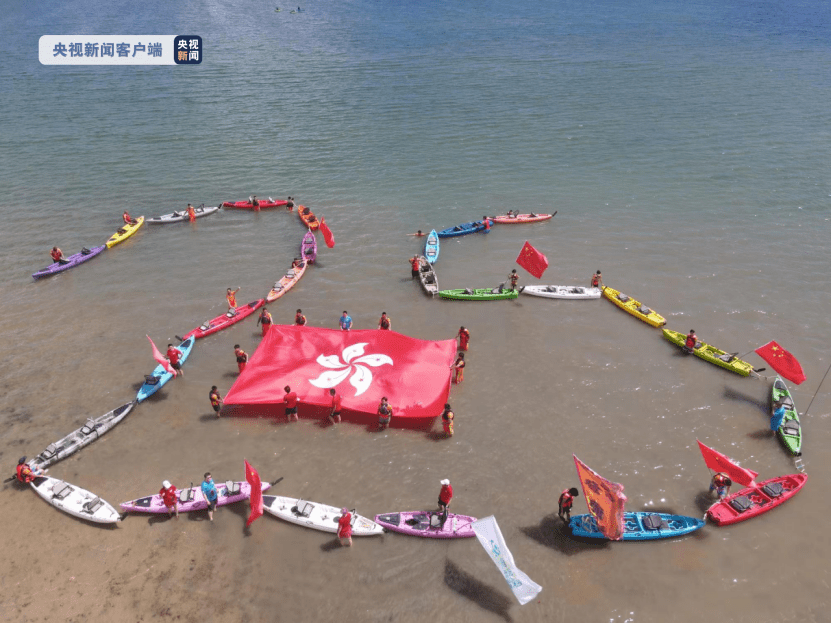 6月27日,“慶回歸25周年——18區關愛大行動”系列活動之“25醒獅水上舞 體藝傳承慶回歸”在香港汀角路灣海灘舉行。活動共計50余人參與。參與者在海面上展示大型區旗,獻上對香港回歸祖國25周年的祝福。