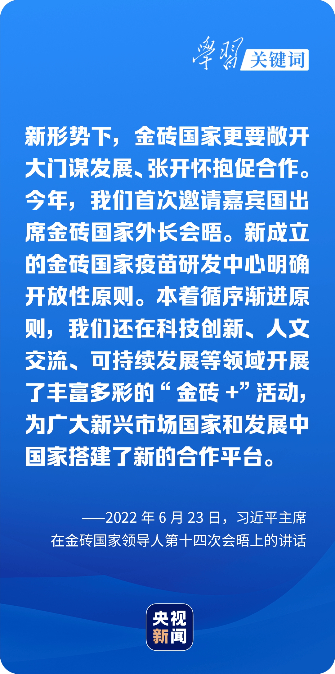 6月22日至24日,習近平主席出席金磚國家工商論壇開幕式,主持金磚國家領導人第十四次會晤、全球發展高層對話會。