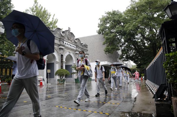 6月27日,北京二中學(xué)生在出示健康碼、接受體溫檢測后按照指定通道進(jìn)入校園。(新華社發(fā))
