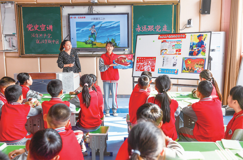 江西省宜春市宜豐縣各中小學校常態化開展黨史教育進校園主題活動。圖為2022年3月15日,宜豐縣橋西中心小學的學生在思政課上分享自己的黨史學習感悟。 人民圖片 周亮/攝