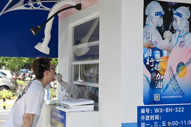 7月5日,在無錫市濱湖區(qū)蠡園街道的一處核酸采樣點,一名市民在進(jìn)行核酸采樣。