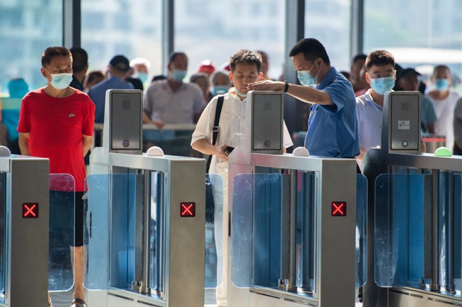 7月1日,在株洲火車站安檢區(qū),旅客進(jìn)行人臉識別通過安檢。