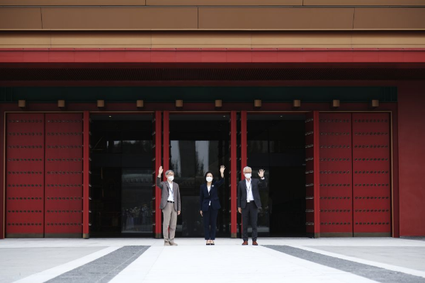 2022年5月10日,在香港故宮文化博物館,西九文化區(qū)管理局行政總裁馮程淑儀(中)、香港故宮文化博物館館長吳志華(右)和香港故宮文化博物館設計師嚴迅奇(左)在揮手致意。新華社記者 王申 攝