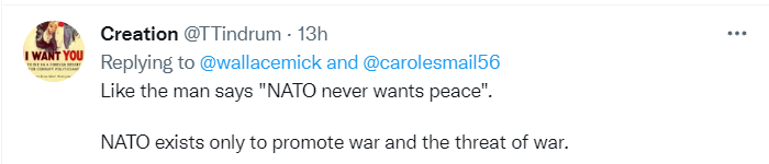 “就像這位男士所說,‘北約從未想要和平’。北約之所以存在,只是為了推動戰爭和發出戰爭威脅。”