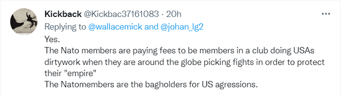 “是的。當北約成員國在全球進行戰斗以保護他們的‘帝國’時,他們是在自己出錢,成為替美國干臟活俱樂部的成員。北約成員國是為美國侵略投資的冤大頭。”