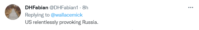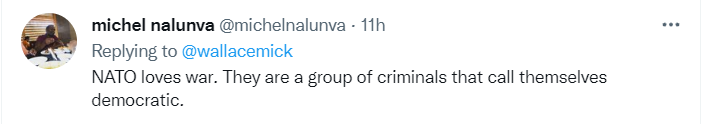 10日,華萊士以同樣的視頻配上不同的文字發了兩條推文,配文是他在視頻中講話的節選。“北約不是一個防御聯盟,而是一臺戰爭機器,”華萊士說,“去問問阿富汗、伊拉克和利比亞人民就知道了。北約的真正目的是捍衛正在衰落的美國霸權以及一個單極世界體系,北約為此而存在。”