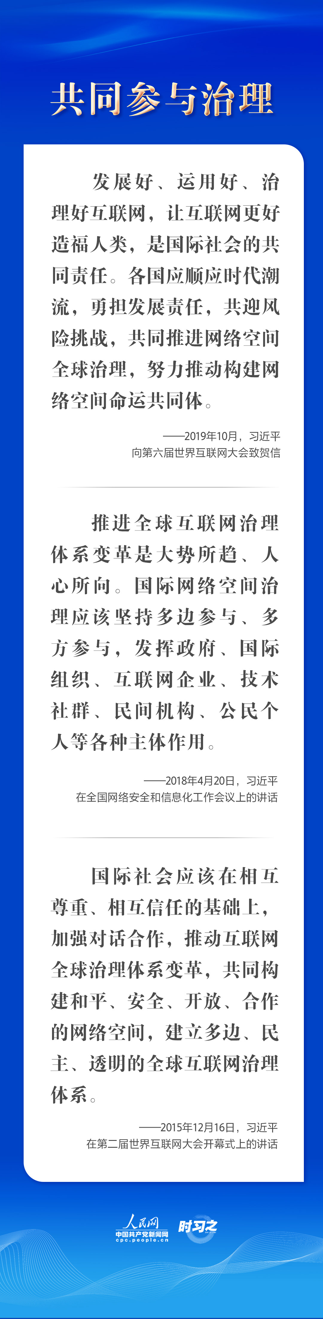 “我們倡導‘四項原則’、‘五點主張’,就是希望與國際社會一道,尊重網絡主權,發(fā)揚伙伴精神,大家的事由大家商量著辦,做到發(fā)展共同推進、安全共同維護、治理共同參與、成果共同分享。”互聯(lián)網飛速發(fā)展的同時也帶來了許多新挑戰(zhàn)。面對新問題、新挑戰(zhàn),中共中央總書記、國家主席、中央軍委主席習近平用“四個共同”為網絡空間治理貢獻中國智慧。