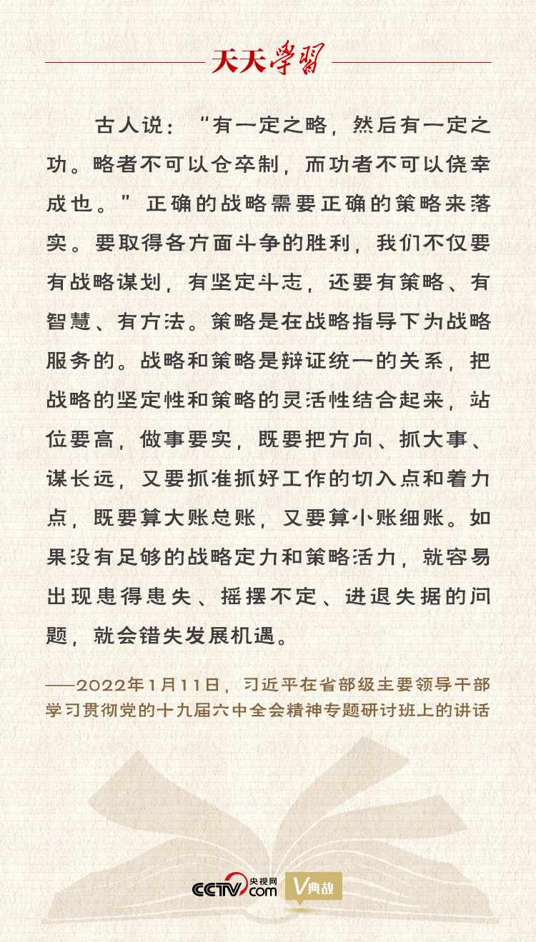 戰(zhàn)略問題是一個(gè)政黨、一個(gè)國家的根本性問題,正確的戰(zhàn)略需要正確的策略來落實(shí)。2022年1月11日,在省部級(jí)主要領(lǐng)導(dǎo)干部學(xué)習(xí)貫徹黨的十九屆六中全會(huì)精神專題研討班上,習(xí)近平總書記引用上述古語強(qiáng)調(diào):“把戰(zhàn)略的堅(jiān)定性和策略的靈活性結(jié)合起來,站位要高,做事要實(shí),既要把方向、抓大事、謀長遠(yuǎn),又要抓準(zhǔn)抓好工作的切入點(diǎn)和著力點(diǎn),既要算大賬總賬,又要算小賬細(xì)賬。”為我們?cè)诮鉀Q突出問題中實(shí)現(xiàn)戰(zhàn)略突破、在把握戰(zhàn)略全局中推進(jìn)各項(xiàng)工作提供了根本遵循。