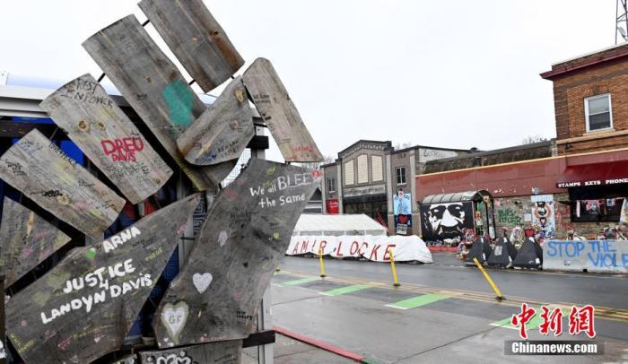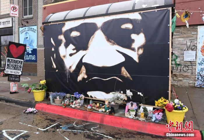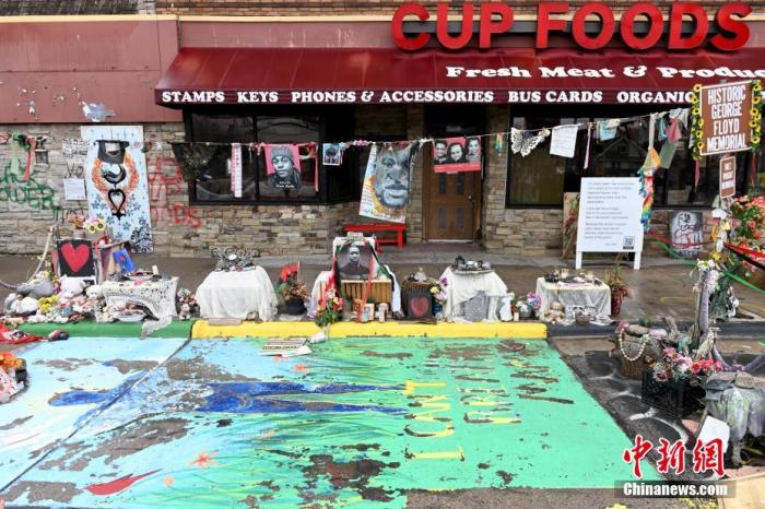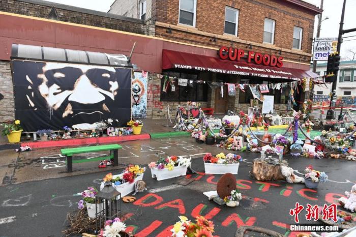 圖為弗洛伊德遭警察“跪壓”的事發(fā)地,如今由民間自發(fā)形成了一片紀念園地。