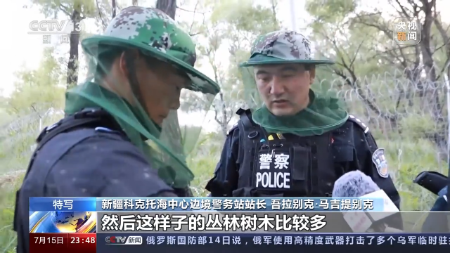 新疆科克托海中心邊境警務站站長吾拉別克·馬吉提別克:最早沒有這個防蚊帽的時候,我們都是買的成卷的紗布、紗網然后就套到頭上,拿繩子在脖子這塊纏一下,手腳纏上以后就這樣走。