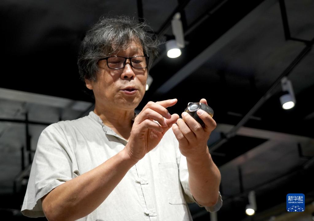 郭愛(ài)和在“洛陽(yáng)三彩陶藝村”向參觀者介紹陶瓷作品(7月13日攝)。新華社記者 李安 攝