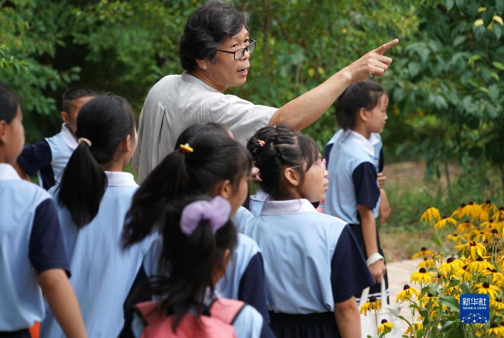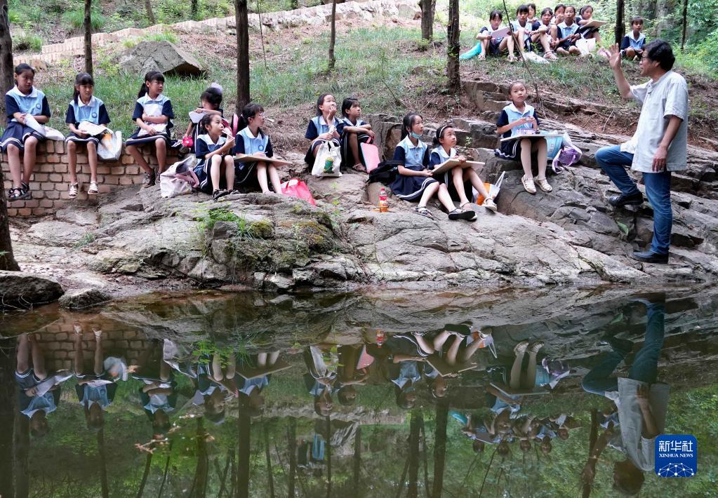 在“洛陽(yáng)三彩陶藝村”,郭愛(ài)和帶領(lǐng)羅嶺鄉(xiāng)中心小學(xué)的學(xué)生寫(xiě)生(7月12日攝)。新華社記者 李安 攝