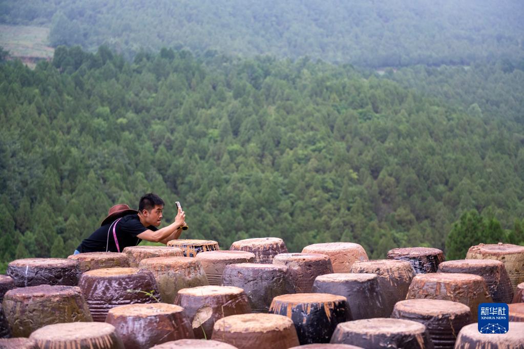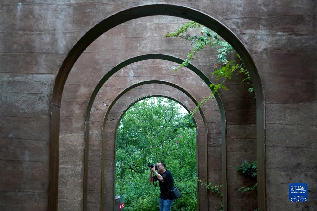 游客在“洛陽(yáng)三彩陶藝村”游覽拍照(7月13日攝)。新華社記者 李安 攝