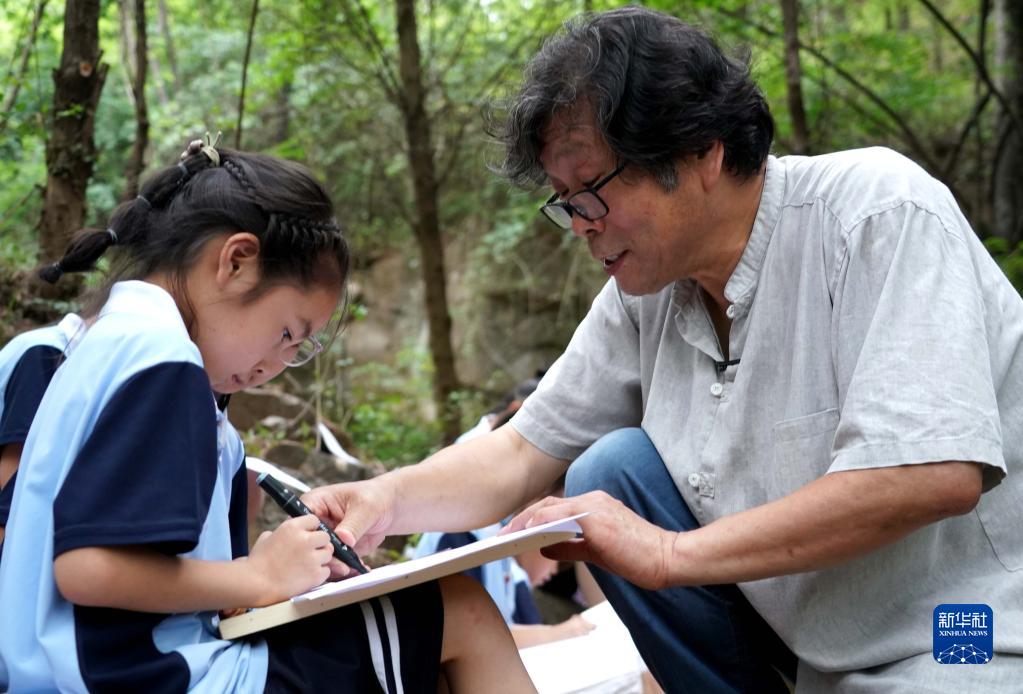 在“洛陽(yáng)三彩陶藝村”,郭愛(ài)和指導(dǎo)羅嶺鄉(xiāng)中心小學(xué)學(xué)生寫(xiě)生(7月12日攝)。新華社記者 李安 攝