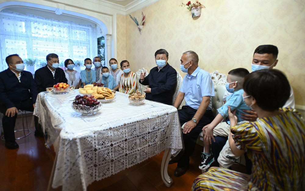 這是7月13日上午,習(xí)近平在烏魯木齊市天山區(qū)固原巷社區(qū),同維吾爾族居民阿布來(lái)提·吐?tīng)栠d一家人圍坐在一起拉家常。