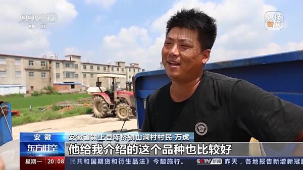 安徽潁上縣陳橋鎮(zhèn)山澗村村民 萬(wàn)虎:今年趕個(gè)豐收年,我的收成也比較滿意,他給我介紹的這個(gè)品種也比較好。