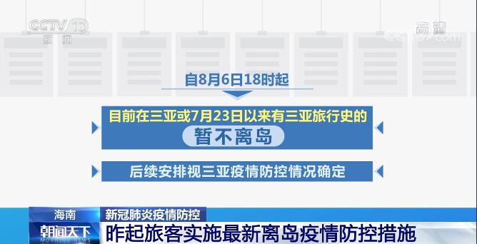 自8月6日18時(shí)起,目前在三亞或7月23日以來(lái)有三亞旅行史的,暫不離島,后續(xù)安排視三亞疫情防控情況確定;7月23日以來(lái)無(wú)三亞旅行史,目前在涉疫市縣(區(qū))且在管控區(qū)域外的,72小時(shí)3次核酸檢測(cè)陰性,并完成風(fēng)險(xiǎn)排查后方可離島;7月23日以來(lái)無(wú)三亞旅行史,目前在非涉疫市縣(區(qū)),48小時(shí)2次核酸檢測(cè)陰性,并完成風(fēng)險(xiǎn)排查后方可離島。