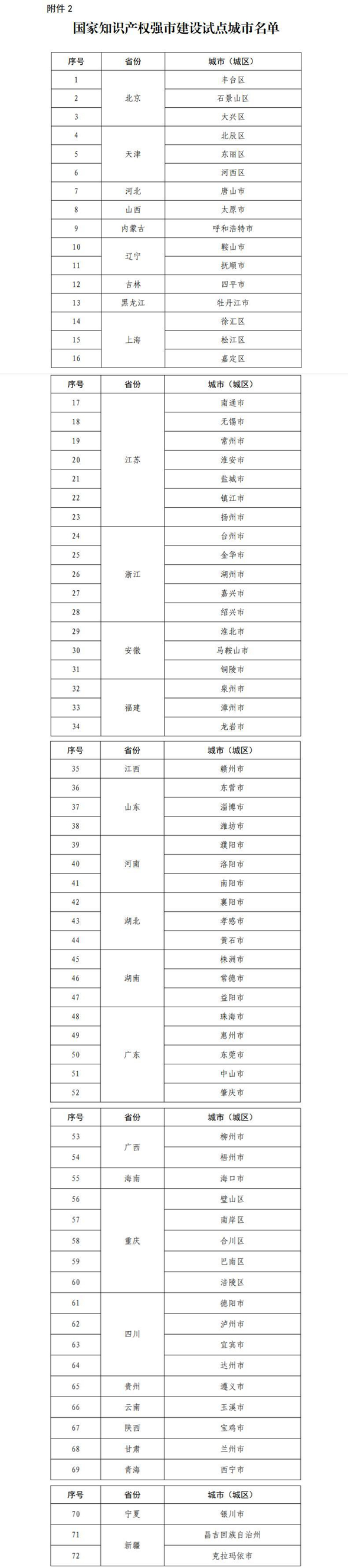 按照《國家知識產權局辦公室關于面向城市、縣域、園區開展知識產權強國建設試點示范工作的通知》(國知辦函運字〔2021〕1197號)要求,經地方申報推薦、材料審查、專家評審等程序,確定北京市海淀區等38個城市(城區)為國家知識產權強市建設示范城市(名單見附件1),北京市豐臺區等72個城市(城區)為國家知識產權強市建設試點城市(名單見附件2),試點示范時限自2022年7月至2025年6月。