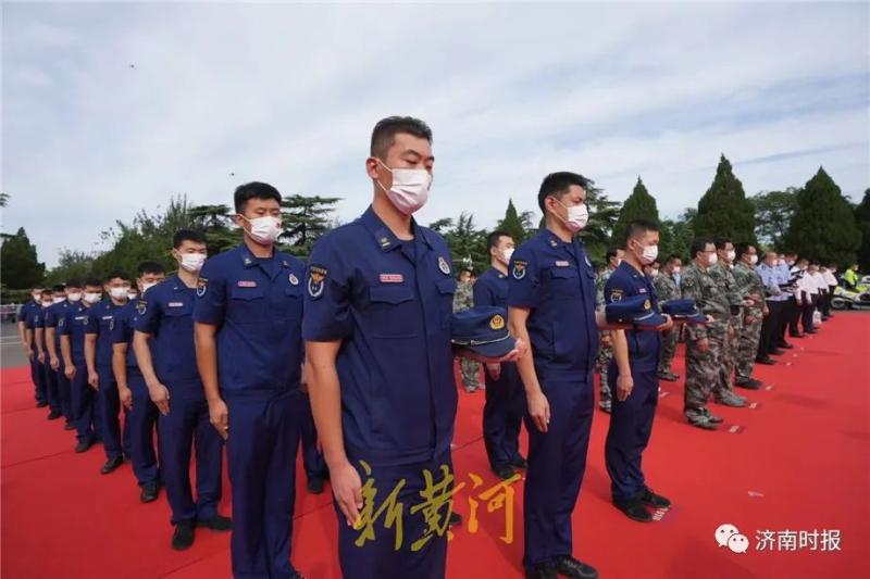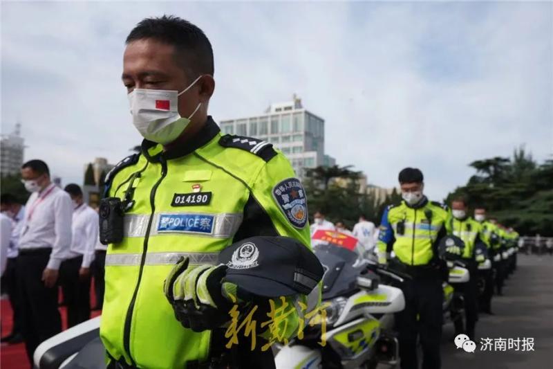 車隊在經十路上行駛,執勤交警面向車隊敬禮。
