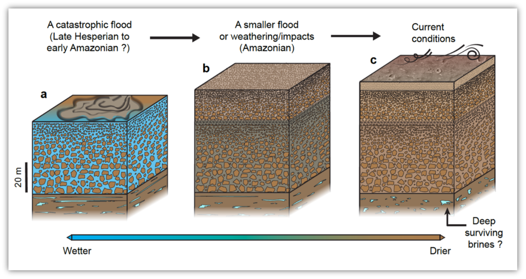 研究人員發現,該區域數米厚的火星土壤層之下存在兩套向上變細的沉積層序:第一套層序位于火星表面以下約10至30米,含有較多石塊,其粒徑隨深度逐漸增大;第二套層序位于火星表面以下約30至80米,其石塊粒徑更大,可達米級,且分布更為雜亂,反映了更古老、更大規模的火星表面改造事件。
