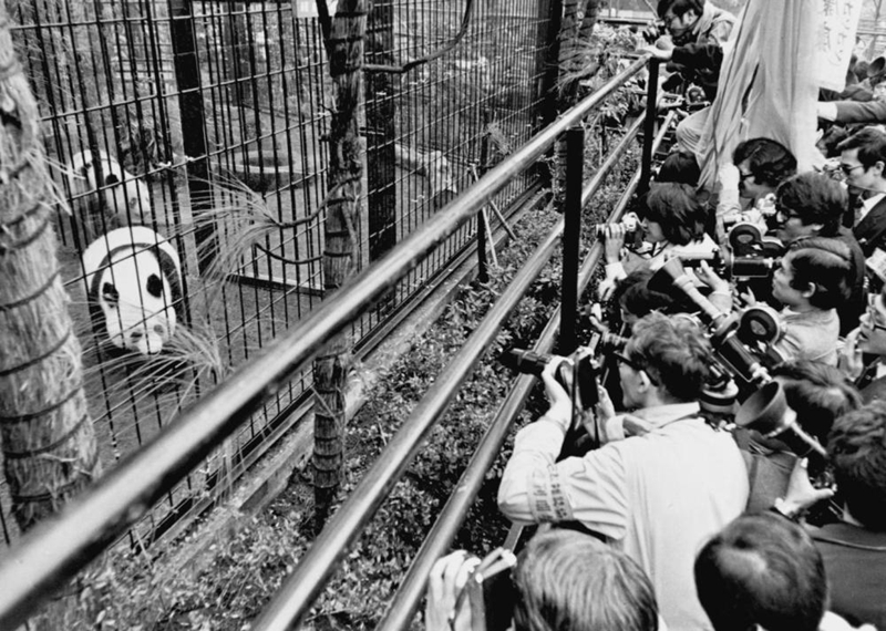 1972年10月28日,第一批旅日大熊貓“康康”和“蘭蘭”乘專機(jī)抵達(dá)東京,時(shí)任內(nèi)閣官房長(zhǎng)官二階堂進(jìn)親自前往機(jī)場(chǎng)迎接。從機(jī)場(chǎng)到上野動(dòng)物園,一路由警車開(kāi)道、百余名警備人員護(hù)送。同年11月初,“康康”和“蘭蘭”首次公開(kāi)亮相時(shí),6萬(wàn)名游客將上野動(dòng)物園擠得水泄不通。次年,上野動(dòng)物園入場(chǎng)人數(shù)創(chuàng)下920萬(wàn)人的最高紀(jì)錄。日本動(dòng)漫《櫻桃小丸子》曾再現(xiàn)當(dāng)時(shí)全民轟動(dòng)爭(zhēng)相一睹大熊貓的場(chǎng)面。