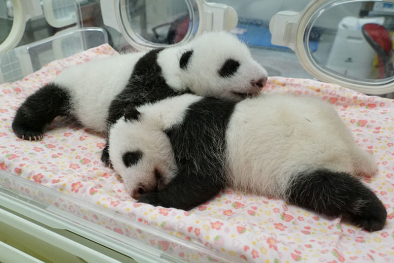 這是2021年8月5日拍攝的大熊貓幼崽“蕾蕾”(左)和“曉曉”(右)。新華社發(fā)(東京動(dòng)物園協(xié)會(huì)供圖)