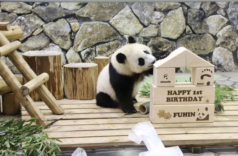 這是2021年11月22日在日本和歌山縣拍攝的大熊貓幼崽“楓浜”生日會(huì)現(xiàn)場(chǎng)。新華社記者姜俏梅攝