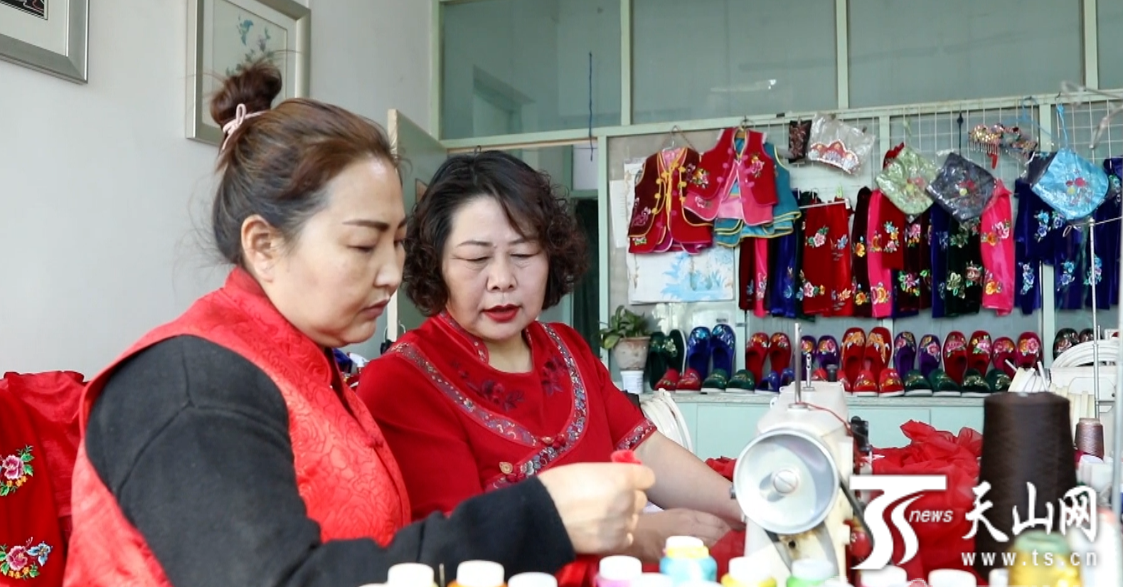 李萍(右)在刺繡合作社與繡娘一起研究產品樣式。李萍供圖