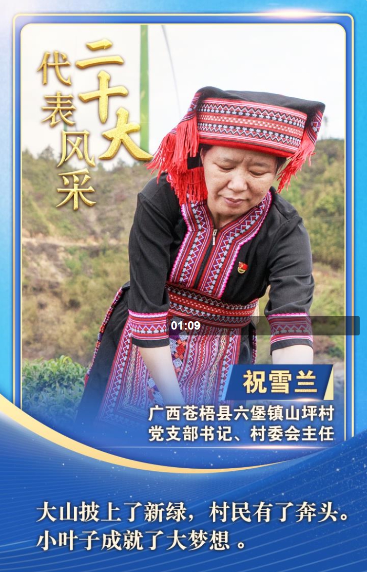 “二十大代表風采”一起來認識廣西蒼梧縣山坪村黨支部書記、村委會主任祝雪蘭。