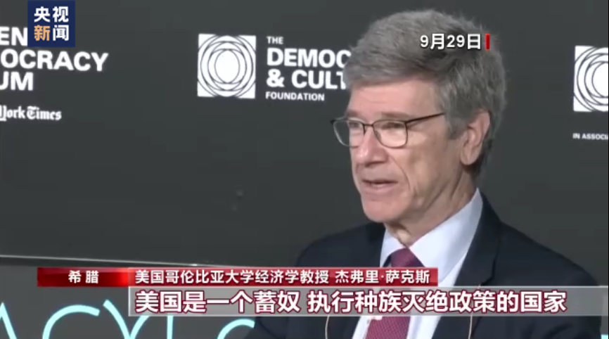 9月29日,杰弗里·薩克斯在希臘的一個論壇上作為嘉賓發(fā)言。在發(fā)言中,他痛斥以美國為代表的所謂“西方民主”赤裸裸的雙標性,卻遭到論壇主持人多次打斷。